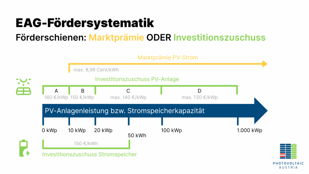 Die wichtigste Unterstützung ist die Bundesförderung nach dem Erneuerbaren-Ausbau-Gesetz (EAG). Sie wird als Investitionszuschuss oder Marktprämie vergeben und richtet sich nach festen Fördersätzen oder einer „verkehrten Versteigerung“. Zusätzlich bieten die Bundesländer sowie der Klima- und Energiefonds eigene Programme.